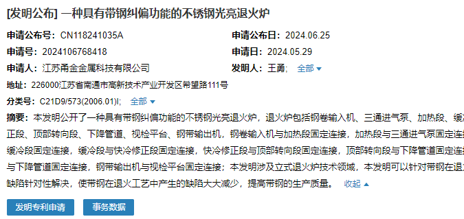 2024年6月25日,江蘇甬金金屬科技有限公司成功申請(qǐng)一項(xiàng)名為“一種具有帶鋼糾偏功能的不銹鋼光亮退火爐”專利,申請(qǐng)公布號(hào)CN118241035A,申請(qǐng)日期為2024年5月29日。