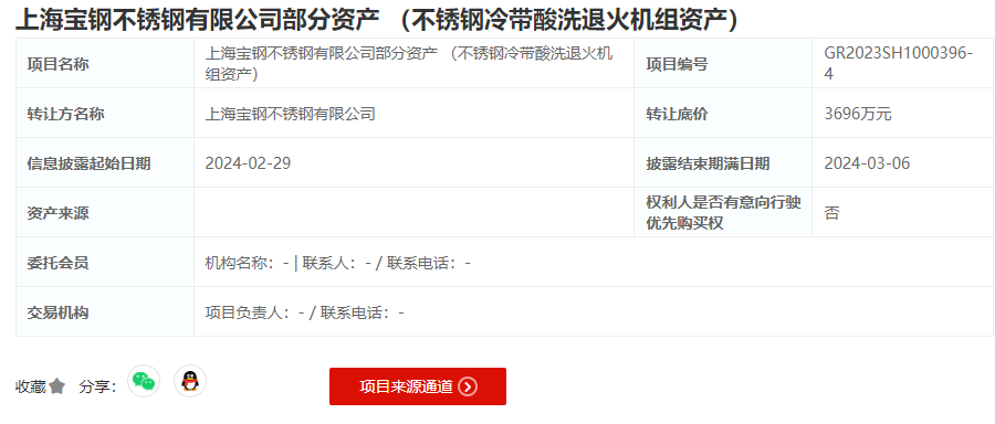 2024年2月29日,上海寶鋼不銹鋼有限公司以底價(jià)3696萬元轉(zhuǎn)讓不銹鋼冷帶酸洗退火機(jī)組資產(chǎn)。