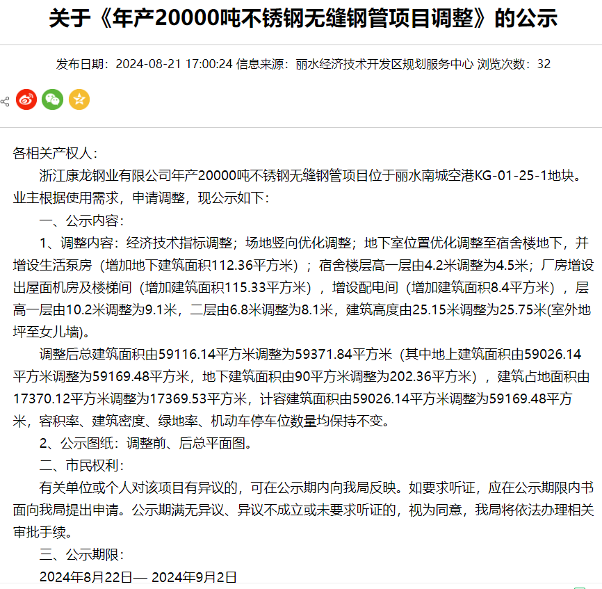 8月22日,浙江康龍鋼業有限公司年產20000噸不銹鋼無縫鋼管項目調整公示,公示期:2024年8月22日-2024年9月2日。