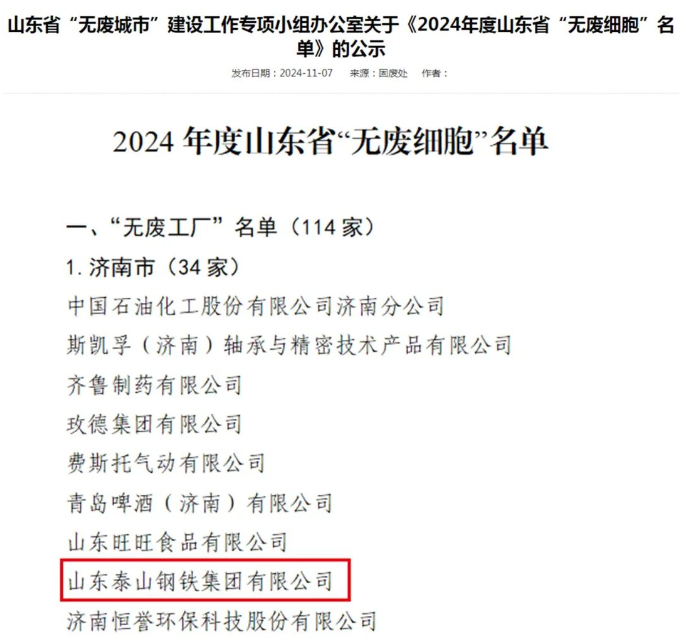 11月7日,山東省生態(tài)環(huán)境廳公布2024年度山東省“無廢細(xì)胞”名單,泰山鋼鐵集團獲評首批省級“無廢工廠”。